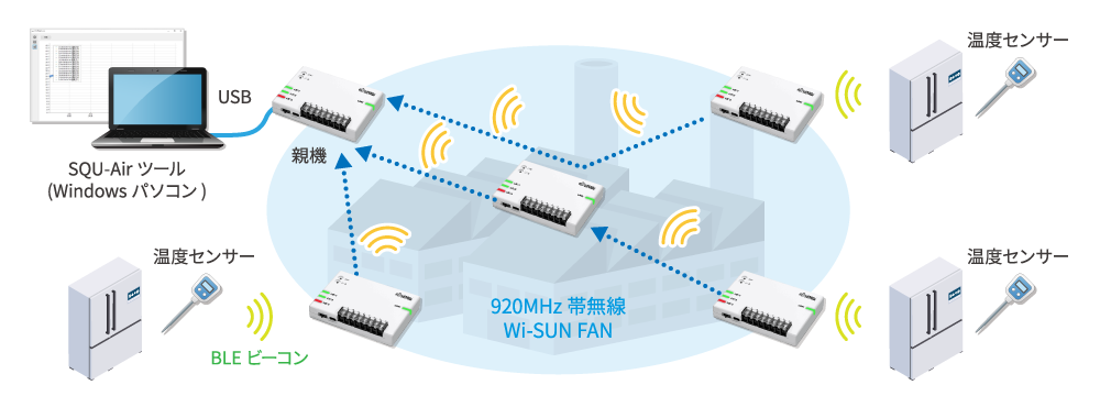 中継用のSQU-Airを設置してマルチホップ通信することで無線通信の距離を延ばし、