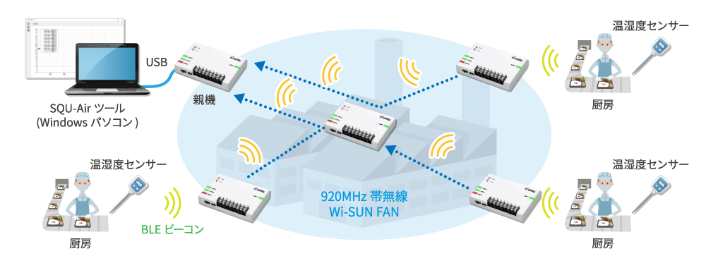 中継用のSQU-Airを設置してマルチホップ通信することで無線通信の距離を延ばし、