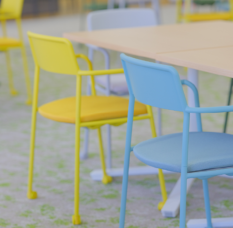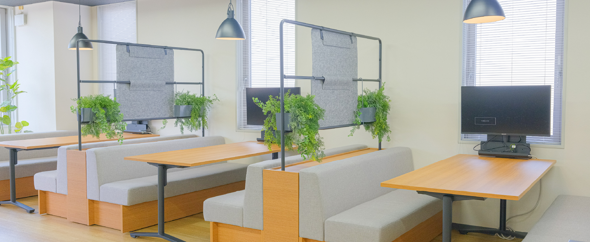 メーカー担当者のお力も借りながら、コンセプト設計から一緒に取り組みました。全体的に明るくカジュアルな空間作りを意識しました。木目が美しい木材を使用したり、全体的に緑が多い空間にすることで「おしゃれなカフェ」にいるような感覚でリフレッシュできるのではないかと思います。